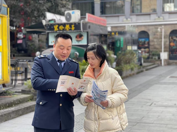 南岸區(qū)稅務(wù)局的工作人員到龍門浩老街為企業(yè)講解稅收優(yōu)惠政策。劉晉宏攝