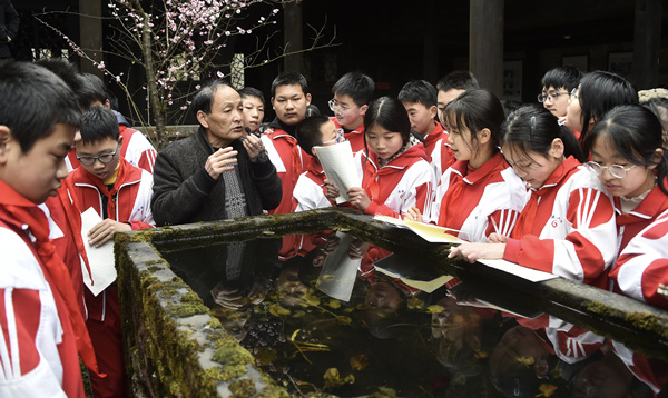 人民網(wǎng)重慶2月17日電 “這個石墩上面雕刻的是核桃仁,代表做人要仁義”“這上面刻了一首《陋室銘》,表示當(dāng)時的主人希望他的后人做人要低調(diào),生活要簡樸,懂得節(jié)約”。2月17日,新學(xué)期開學(xué)第二天,涪陵區(qū)青羊鎮(zhèn)陳萬寶莊園內(nèi),青羊鎮(zhèn)文化服務(wù)中心負(fù)責(zé)人熊中圣正在給涪陵六中的學(xué)生們宣傳講解陳萬寶莊園所蘊(yùn)含的傳統(tǒng)文化內(nèi)涵,并教導(dǎo)孩子們做人的道理。