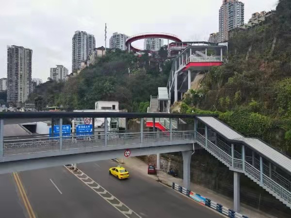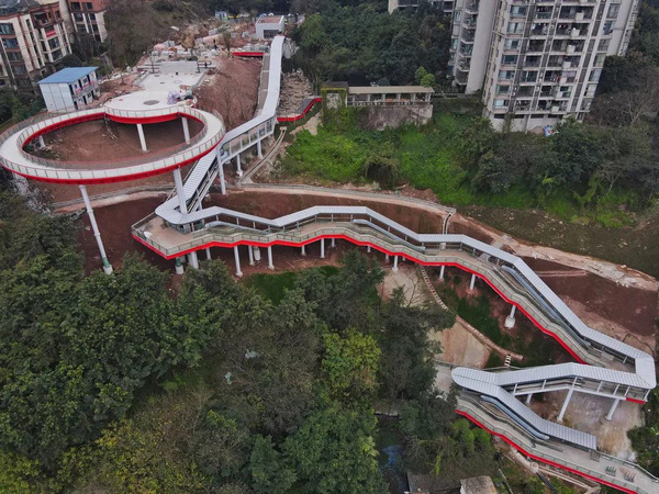人民網(wǎng)2月21日電 紅色步道沿著山體蜿蜒而下,步道內(nèi)還有圓形的觀景平臺(tái)。近日,隨著南岸區(qū)蘇家壩步道觀景平臺(tái)主體工程全部完工,這個(gè)便捷又美麗的新景觀,未通先火了起來,目前工人正加緊綠化和裝飾收尾工作。