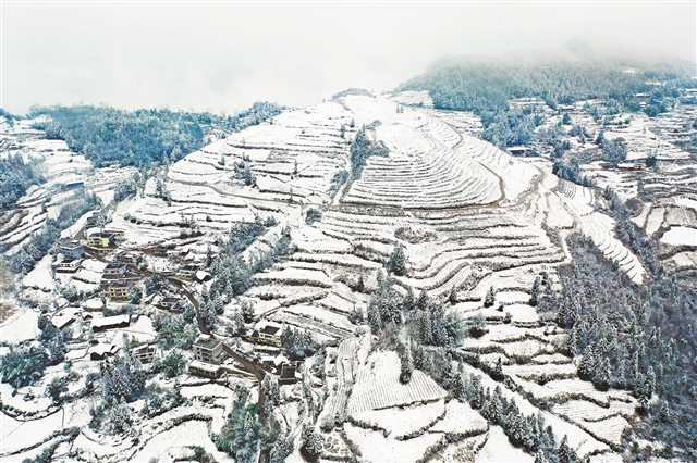 2月22日,“春雪”覆蓋著黔江區(qū)中塘鎮(zhèn)雙石村的“脫貧茶園”。當(dāng)天,受冷空氣影響,黔江區(qū)海拔600米的地區(qū)白雪皚皚。特約攝影 楊敏/視覺(jué)重慶