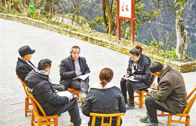 二月十五日,巫山縣竹賢鄉(xiāng)下莊村,毛相林(左三)和村干部及駐村干部開院壩會謀劃工作。