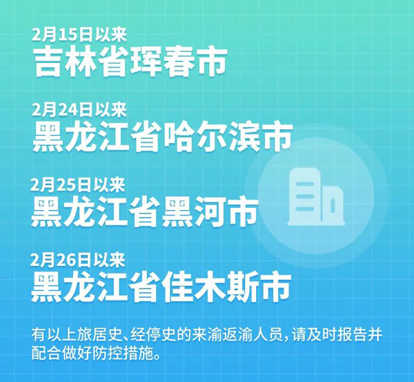 3月1日新增:佳木斯市、黑河市、哈爾濱市、琿春市