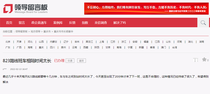 近日,有網(wǎng)友在人民網(wǎng)“領(lǐng)導(dǎo)留言板”上留言,反映由重慶市九龍坡區(qū)五龍廟至芳草地的823路公交車(chē)間隔時(shí)間過(guò)長(zhǎng),希望優(yōu)化發(fā)車(chē)次數(shù)。對(duì)此,重慶交通開(kāi)投集團(tuán)方面十分重視,并第一時(shí)間了解了相關(guān)情況。