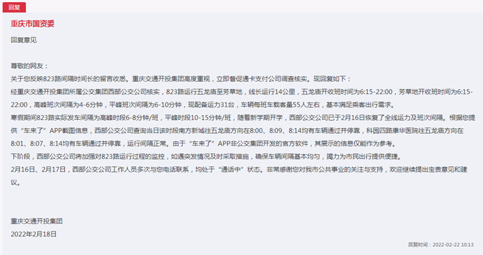 網(wǎng)友留言三天后,重慶交通開(kāi)投集團(tuán)回復(fù):經(jīng)所屬公交集團(tuán)西部公交公司核實(shí),823路運(yùn)行五龍廟至芳草地,線長(zhǎng)運(yùn)行14公里,五龍廟開(kāi)收班時(shí)間為6:15-22:00,芳草地開(kāi)收班時(shí)間為6:15-22:00,高峰班次間隔為4-6分鐘,平峰班次間隔為6-10分鐘,現(xiàn)配備運(yùn)力31臺(tái),車(chē)輛每班車(chē)載客量55人左右,基本滿足乘客出行需求。