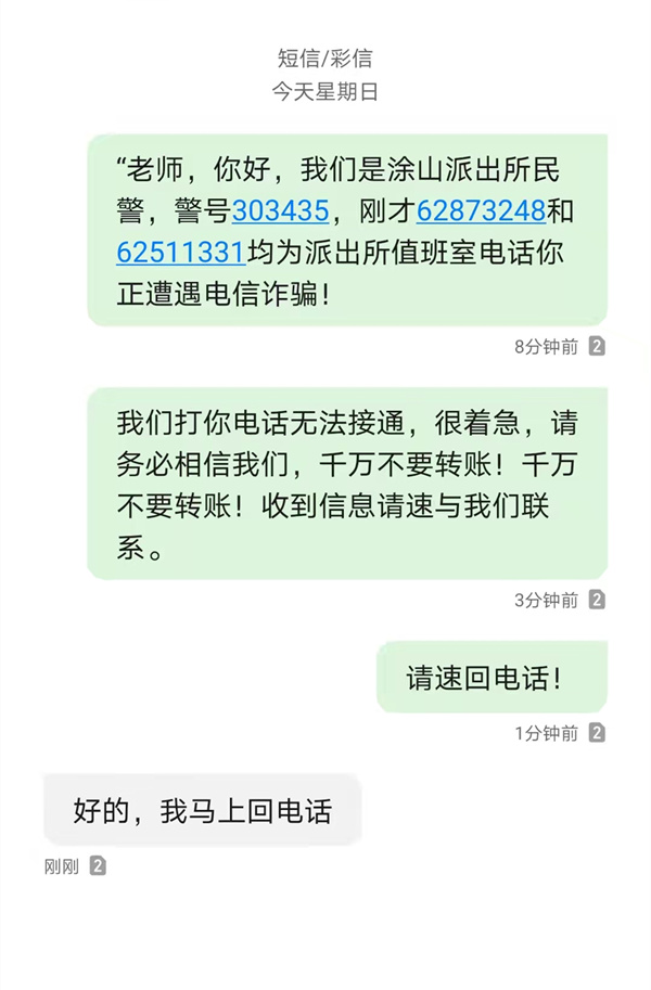 “老師,你好,我們是涂山派出所民警,警號(hào)303435,剛才62873248和62511331均為派出所值班室電話,你正遭遇電信詐騙!”