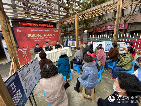 民警志愿者為居民群眾普及反詐知識(shí)。人民網(wǎng) 劉政寧攝