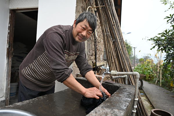 2021年12月14日金刀峽鎮(zhèn)勝天湖村、永安村部分飲水安全鞏固提升項(xiàng)目完成,圖為永安村呂家壩組余玉勝用自來(lái)水清洗衣物。北碚區(qū)水利局供圖