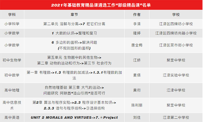 據(jù)了解,2021年底,重慶市教委公布了《重慶市“基礎(chǔ)教育精品課”遴選工作“市級精品課”名單》,江津區(qū)39節(jié)課例獲得“市級精品課”,并報送參加部級評選(重慶市共評選857節(jié))。