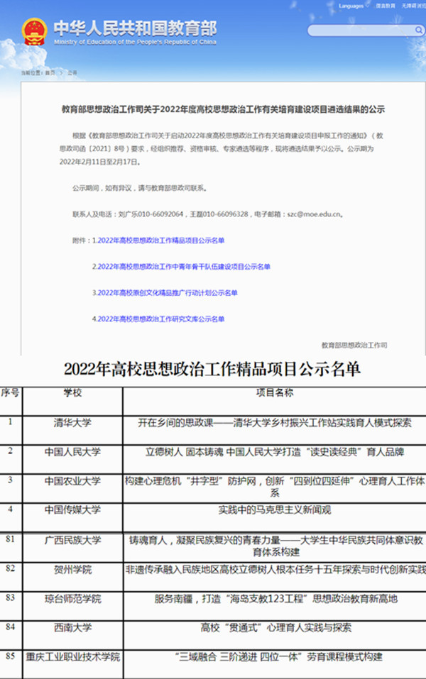 教育部“2022年高校思想政治工作精品項(xiàng)目公示名單”部分入選項(xiàng)目。重慶工業(yè)職院供圖