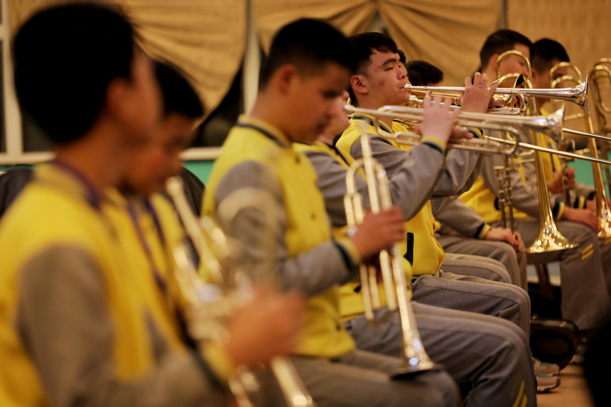 2月8日,47名樂(lè)手赴北京集訓(xùn)。為了完美地展現(xiàn),盲孩子積極記譜、演奏、排練,但這只是完成了第一步!白畲蟮睦щy是站立、隊(duì)列行走和持樂(lè)器姿勢(shì)的訓(xùn)練、表情的管理。”首席小號(hào)手王太樊說(shuō),出場(chǎng)時(shí)持樂(lè)器的姿勢(shì)、預(yù)備演奏時(shí)上樂(lè)器的動(dòng)作等,看起來(lái)簡(jiǎn)單,但對(duì)于樂(lè)手們來(lái)說(shuō)太難了。重復(fù)了上百次的訓(xùn)練,樂(lè)手們才做到了節(jié)奏一致、整齊劃一。