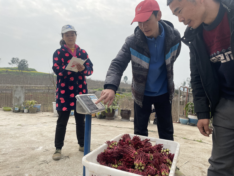 香椿種植大戶肖登發(fā)(中)過稱采摘的新鮮椿芽。合川區(qū)委宣傳部供圖