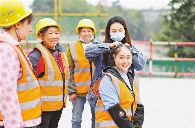 3月5日,在中建八局四公司西南公司一項(xiàng)目部,化妝師為建筑女工化妝。特約攝影 孫凱芳/視覺重慶