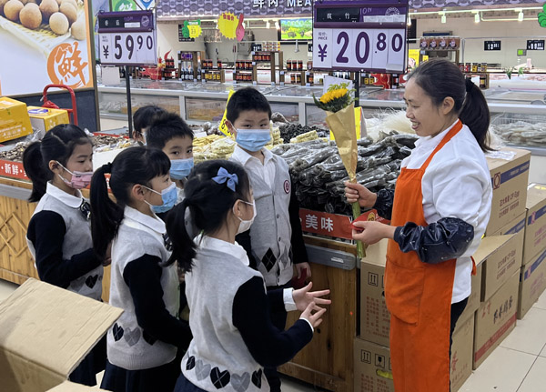 孩子們向超市售貨員贈(zèng)送節(jié)日禮物。魯能巴蜀小學(xué)供圖