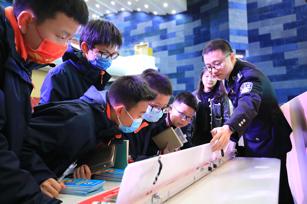 民警周圍現(xiàn)場(chǎng)向同學(xué)們介紹仿真毒品。胡曉未攝