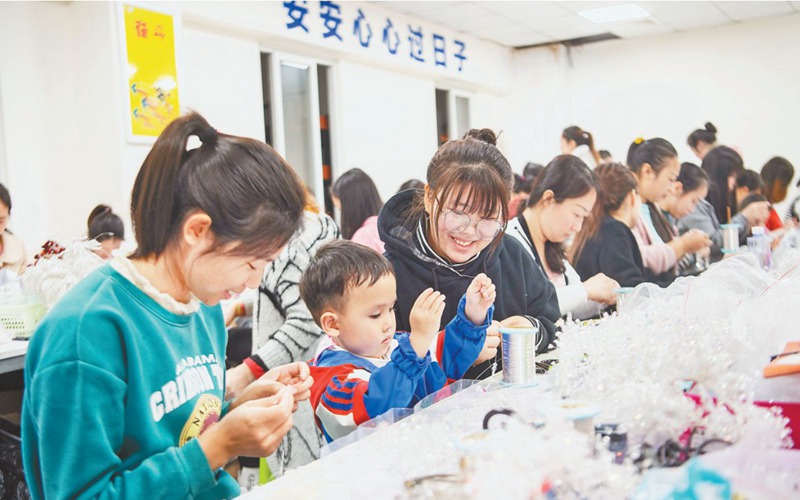 3月9日,九龍坡區(qū)華巖鎮(zhèn)民安華福社區(qū)“雙更”就業(yè)基地的“巧手夢工坊”內,女工們正熟練地工作。