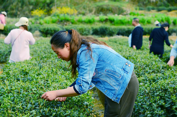 在溜沙村的茶葉基地,漫山遍野的茶樹林里也站滿了采茶工人,他們或手托茶盤,或腰挎竹簍,正熟練地采摘茶葉。
