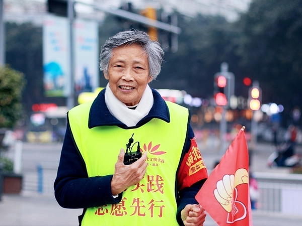 費(fèi)敏秀,大家叫她“費(fèi)婆婆”,今年85歲,是渝北區(qū)最年長(zhǎng)的交通勸導(dǎo)志愿者,也是一名有著63年黨齡的老黨員。她說(shuō):“壽命用年齡計(jì)算,人生價(jià)值用奉獻(xiàn)計(jì)算!