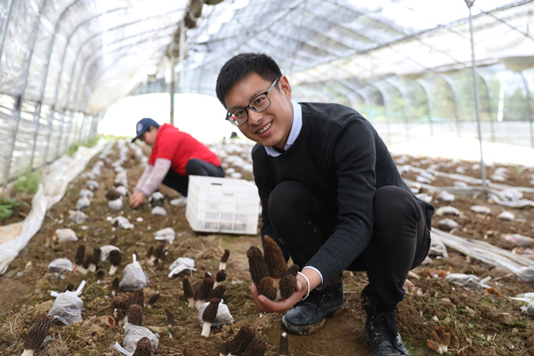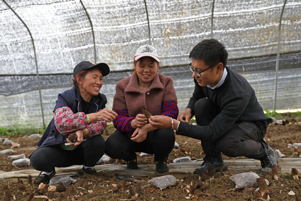 普向嵩(右)正指導村民采摘羊肚菌。趙勇攝
