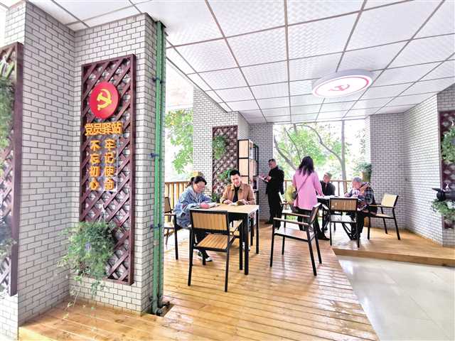 江北區(qū)五里店街道南方上格林小區(qū)黨員群眾在小區(qū)黨群驛站學(xué)習(xí)交流