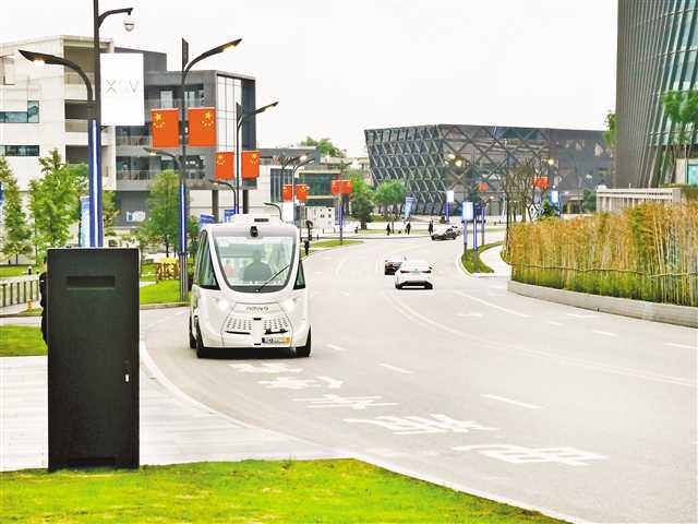 仙桃數(shù)據(jù)谷,無人駕駛L4級(jí)擺渡接駁車在路上行駛。(資料圖片)記者 張亦筑 攝/視覺重慶