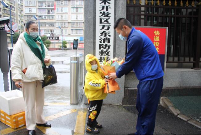 時(shí)隔幾天,浩浩再次來到消防救援站,給幫助過他的消防員叔叔送上鮮花和奶茶。萬盛經(jīng)開區(qū)消防供圖