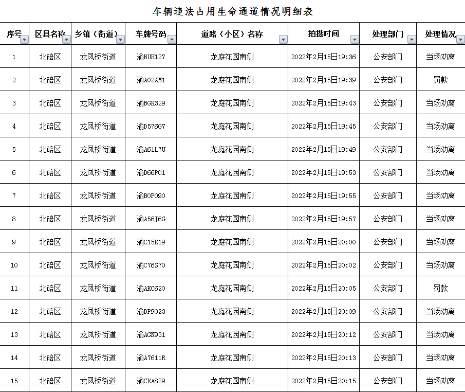 2月18日下午,記者從重慶市消防救援總隊了解到,為持續(xù)深化“生命通道”大曝光大整治大執(zhí)法行動,針對春節(jié)冬奧期間“生命通道”堵塞占用現(xiàn)象反彈的現(xiàn)象,1月25日起,重慶各地消防、城市管理、公安、住房城鄉(xiāng)建設(shè)部門聯(lián)合開展執(zhí)法糾違行動,嚴(yán)查在消防車道停放車輛,私搭亂建、設(shè)置攤位,設(shè)置鐵樁、石墩、水泥墩、限高桿、架空管線等占用、堵塞消防車道違法行為。