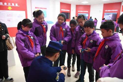 江北區(qū)消防員向?qū)W生教授消防結(jié)繩法。當(dāng)?shù)叵拦﹫D 華龍網(wǎng)-新重慶客戶端 發(fā)