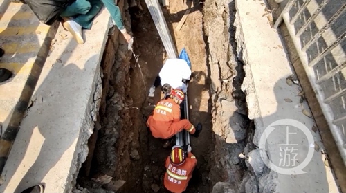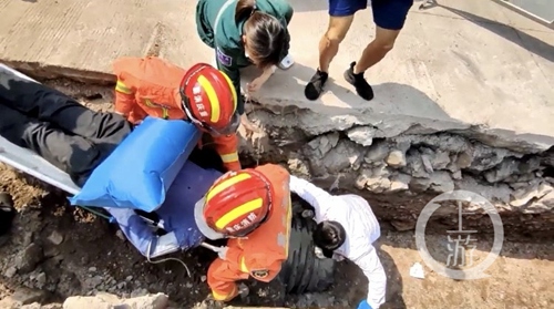 9日下午1點26分,榮昌消防救援支隊接到報警稱,在昌元街道一小區(qū)門口,有人不慎墜入正在施工的下水道深坑中。