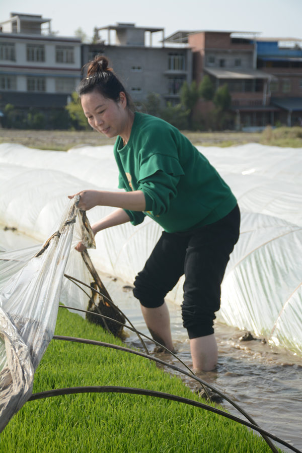 趙興玲察看水稻秧苗長(zhǎng)勢(shì)。余林駿攝
