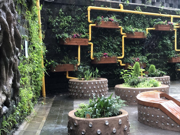 除了墻壁上的自然雨水收集系統(tǒng)外,邢家橋和家生態(tài)花園設(shè)計有鵝卵石按摩區(qū)、休閑座椅以及數(shù)十個大小不一的花池,種植鼠尾草、迷迭香、薄荷、香松、梔子花、睡蓮等數(shù)十種花草植物,儼然成為一處“家門口”的新景點。