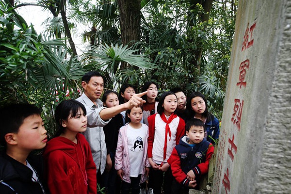 2018年4月4日,在重慶市黔江區(qū)革命烈士陵園,程祖全給掃墓的小學(xué)生講紅軍故事。楊敏攝