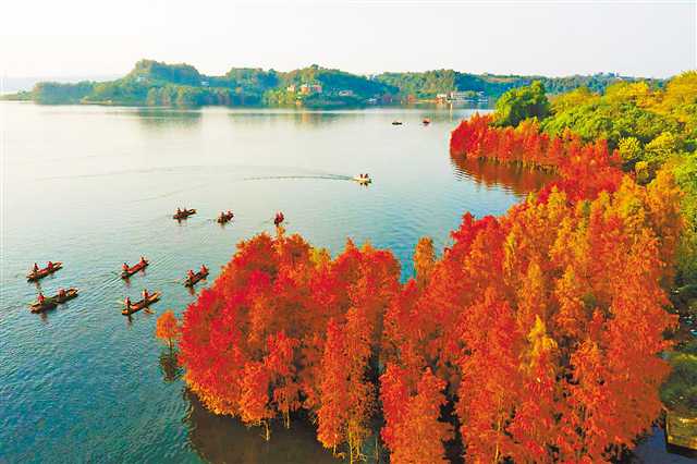 長壽區(qū)長壽湖,湖島漁民劃著船兒去趕網(wǎng)捕魚,與湖岸的水杉風(fēng)景線構(gòu)成了一幅和諧美麗畫卷。(資料圖片)通訊員 樊強(qiáng) 攝/視覺重慶