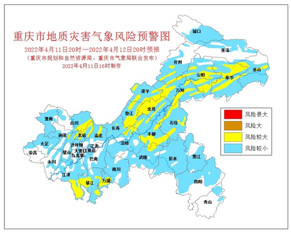 4月11日16時(shí),重慶市規(guī)劃和自然資源局、重慶市氣象局聯(lián)合發(fā)布全市地質(zhì)災(zāi)害氣象風(fēng)險(xiǎn)預(yù)警。
