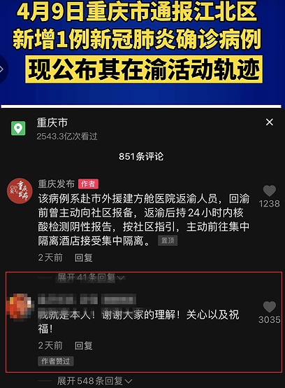 這位千里援建的確診病例牽動(dòng)著重慶人民的心,其在渝期間主要活動(dòng)軌跡公布后,上百萬名網(wǎng)友為他加油,在重慶發(fā)布多個(gè)平臺(tái)的評(píng)論區(qū)留言,向他致敬并祝愿早日康復(fù)。而確診病例A先生本人也在重慶發(fā)布抖音號(hào)的留言區(qū)現(xiàn)身回復(fù),表達(dá)了對(duì)廣大網(wǎng)友的感謝。