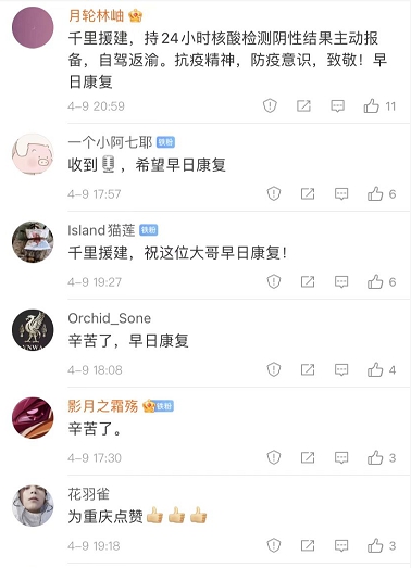 “千里援建,持24小時(shí)核酸檢測(cè)陰性結(jié)果主動(dòng)報(bào)備,自駕返渝?挂呔瘢酪咭庾R(shí),致敬!早日康復(fù)!