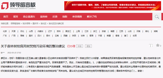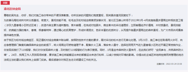重慶市渝北區(qū)林業(yè)局回應(yīng)。人民網(wǎng)“領(lǐng)導(dǎo)留言板”截圖