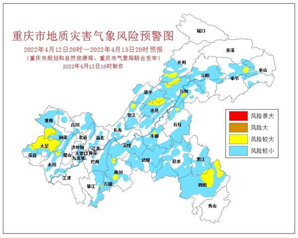 4月12日16時(shí),重慶市規(guī)劃和自然資源局、重慶市氣象局聯(lián)合發(fā)布全市地質(zhì)災(zāi)害氣象風(fēng)險(xiǎn)預(yù)警。