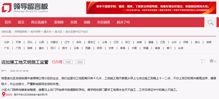 - 網(wǎng)友留言。人民網(wǎng)領(lǐng)導(dǎo)留言板截圖 人民網(wǎng)重慶4月13日電 (陳琦)“我們小區(qū)與附近道路工程工地距離只有十幾米,工地每天從早上七點(diǎn)施工到晚上十一二點(diǎn),噪音、灰塵極大,嚴(yán)重影響居民生活和休息!