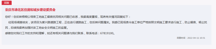 “經(jīng)調(diào)查核實(shí),該項(xiàng)目為紫興路道路工程,正在進(jìn)行道路施工,您反映問(wèn)題屬實(shí)。我委已現(xiàn)場(chǎng)責(zé)令施工單位嚴(yán)格按照文明施工要求進(jìn)行施工,防止噪音、揚(yáng)塵擾民,后續(xù)我委將加強(qiáng)對(duì)該工地安全文明施工的監(jiān)管。”渝北區(qū)住建委回復(fù)稱(chēng)。