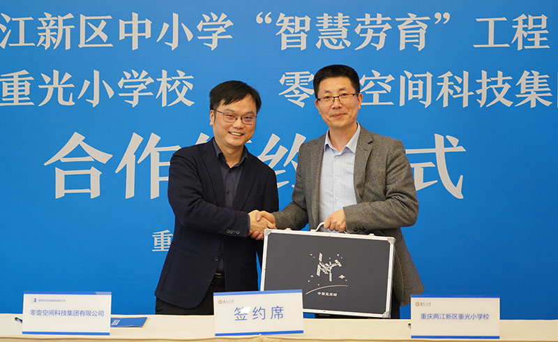 活動(dòng)中,重光小學(xué)校長(zhǎng)李斌、重慶零壹空間副總裁陳江瀾簽署結(jié)對(duì)合作協(xié)議,重慶零壹空間贈(zèng)予重光小學(xué)太空空間站模型。