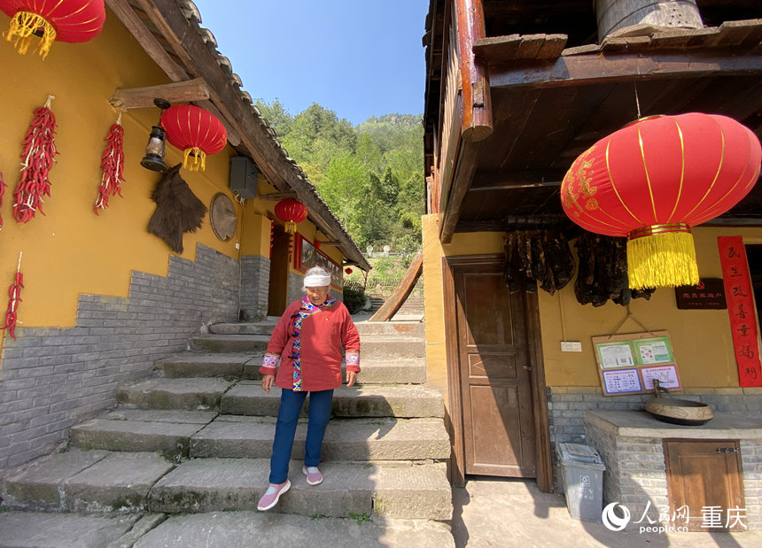 在公路邊下車,走過一段潔凈平整的石板路,便到了89歲村民馬培清老人的家。滿頭銀發(fā)、身著土家族服飾的馬培清正從外面散步回來?!翱?,院里坐?!边~步下石階的老人精神矍鑠,熱情地招呼記者。