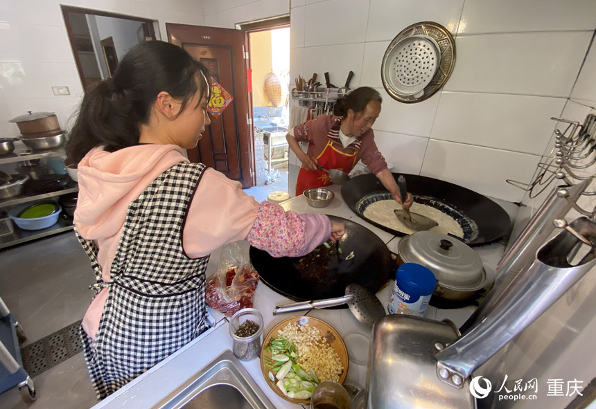 花仁叔(右)和女兒在廚房為客人準(zhǔn)備午餐。人民網(wǎng) 劉政寧攝