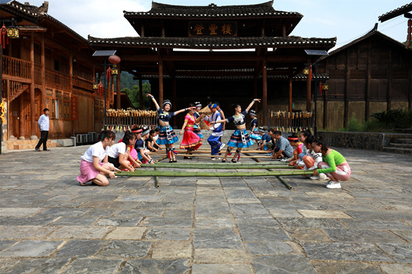 滄溝鄉(xiāng)大田村培訓(xùn)竹竿舞。代娟攝