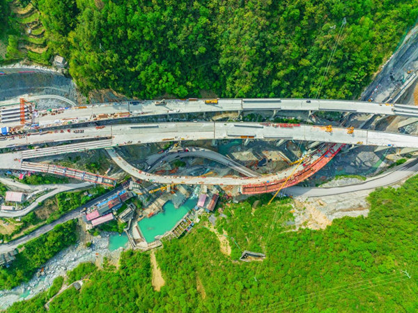 登上雪寶山互通工程最高點(diǎn)俯瞰,只見六條互通匝道、四個(gè)方向都可自由通行的“大渦輪”已初見輪廓,主線橋似長虹臥波,又如巨龍凌空,以蒼勁壯美的身姿、磅礴恢宏的氣度,延綿伸向遠(yuǎn)方。