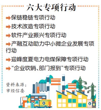 這六大專項(xiàng)行動(dòng)包括保鏈穩(wěn)鏈專項(xiàng)行動(dòng)、技術(shù)改造專項(xiàng)行動(dòng)、軟件產(chǎn)業(yè)振興專項(xiàng)行動(dòng)、產(chǎn)融互動(dòng)助力中小微企業(yè)發(fā)展專項(xiàng)行動(dòng)、迎峰度夏電力電煤保障專項(xiàng)行動(dòng)和“企業(yè)吹哨、部門報(bào)到”專項(xiàng)行動(dòng)。