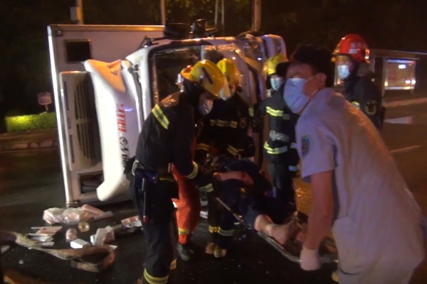 重慶南岸一貨車側(cè)翻孕婦被困 消防員緊急施救
