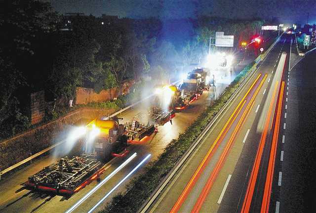 4月21日凌晨,成渝高速白市驛段,重慶高速集團(tuán)通力公司工程人員正通過“再生列車”修復(fù)路面。由于成渝高速車流大,為最大程度減小占道施工對交通的影響,重慶高速集團(tuán)成渝高速就地?zé)嵩偕访骖A(yù)防性養(yǎng)護(hù)工程采取全夜間施工模式,預(yù)計月底全部完工。記者 羅斌 攝/視覺重慶