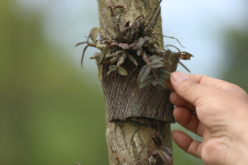 村民查看樹干上鐵皮石斛的長勢。廖唯攝