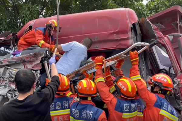 4月27日上午11時許,重慶繞城高速小灣收費站往西彭下道口2公里路段,兩輛貨車追尾。事故導(dǎo)致后車車頭嚴(yán)重變形,司機被困。接到報警后,江津區(qū)消防救援支隊立即調(diào)派距離事發(fā)地最近的鼎山特勤站出動2車14人前往現(xiàn)場處置。