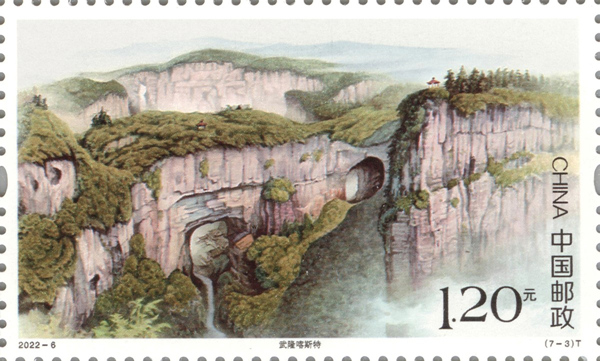 此次發(fā)行的特種郵票表現(xiàn)內(nèi)容分別為云南石林喀斯特、貴州荔波喀斯特、重慶武隆喀斯特、廣西桂林喀斯特、貴州施秉喀斯特、重慶金佛山喀斯特、廣西環(huán)江喀斯特等七處喀斯特典型風(fēng)貌。其中,由芙蓉洞洞穴系統(tǒng)、天生三橋喀斯特系統(tǒng)和后坪沖蝕型天坑喀斯特系統(tǒng)組成的武隆喀斯特,它不僅是反映地球演化歷史的杰出范例,而且還是生命的記錄,正在進(jìn)行的地貌演化 、重要的地貌形態(tài)或自然地理特征。